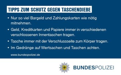 Meldungen Bundespolizeidirektion München: Diebstahl dank Videoauswertung aufgeklärt / Taschendieb im ICE festgenommen München (ots) – Ein 59-jähriger österreichischer Staatsangehöriger meldete sich am…