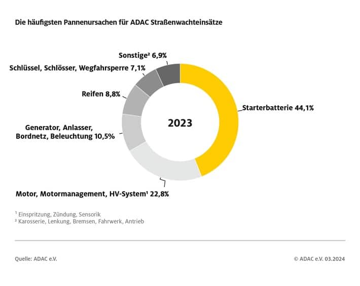 Mit 44,1 Prozent häufigste Pannenursache im Jahr 2023 war nach wie vor eine defekte oder entladenen Starterbatterie. Nummer zwei waren Probleme mit dem Motor beziehungsweise Motormanagement (22,8 Prozent), an dritter Stelle folgten mit deutlichem Abstand Pannen an Anlasser, Lichtmaschine, Bordnetz und Beleuchtung (10,5 Prozent). Auf Platz vier und fünf rangierten die Reifen (8,8 Prozent) und die Schließsysteme (7,1 Prozent). Damit ergibt sich eine ähnliche Verteilung wie im Vorjahr.