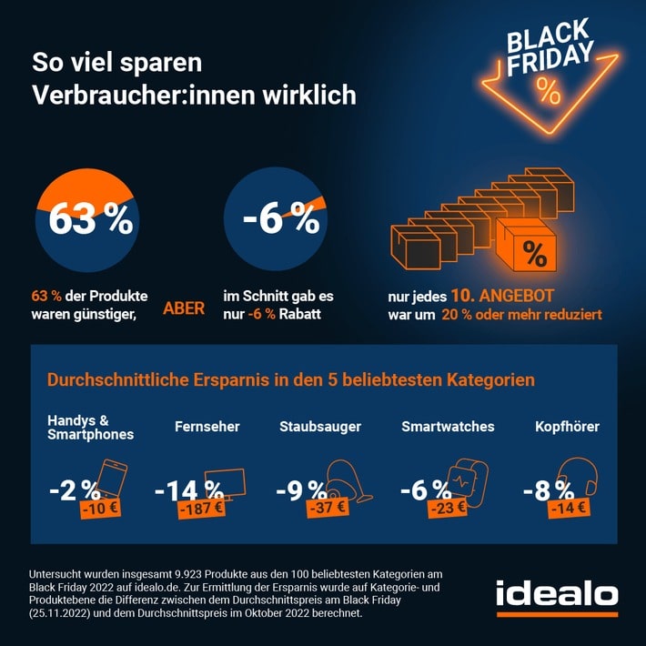[1] Untersucht wurden insgesamt 9.923 Produkte aus den 100 beliebtesten Kategorien am Black Friday 2022 auf idealo.de. Zur Ermittlung der Ersparnis wurde auf Kategorie- und Produktebene die Differenz zwischen dem Durchschnittspreis am Black Friday (25.11.2022) und dem Durchschnittspreis im Oktober 2022 berechnet.