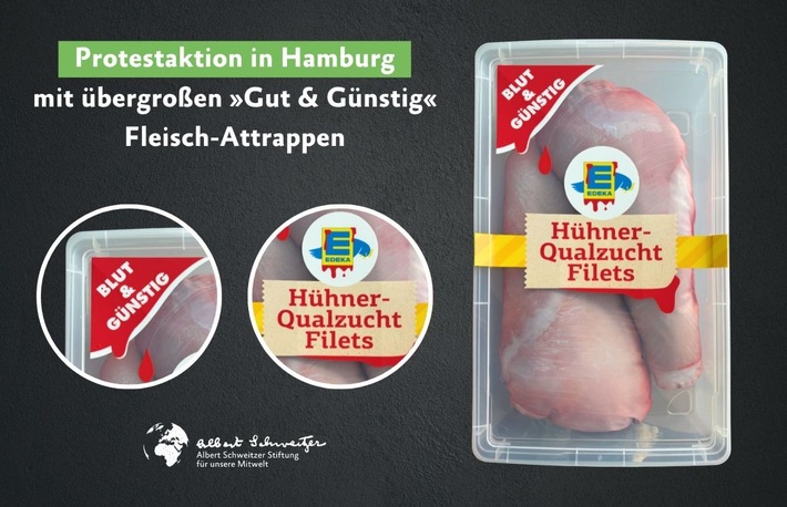 Um den Edeka-Vorstand zum Handeln zu bewegen, protestieren Aktive von der Albert Schweitzer Stiftung für unsere Mitwelt am Mittwoch vor der Edeka-Zentrale in Hamburg. Zur Aktion werden überdimensionale „Gut & Günstig“-Hühnerbrustfiletverpackungen und Masthuhn-Attrappen in Einkaufswagen vor dem Haupteingang platziert. Die Protestierenden stehen zeitgleich mit Bannern, Schildern und starken Botschaften für Fotos, Videos und O-Töne bereit.