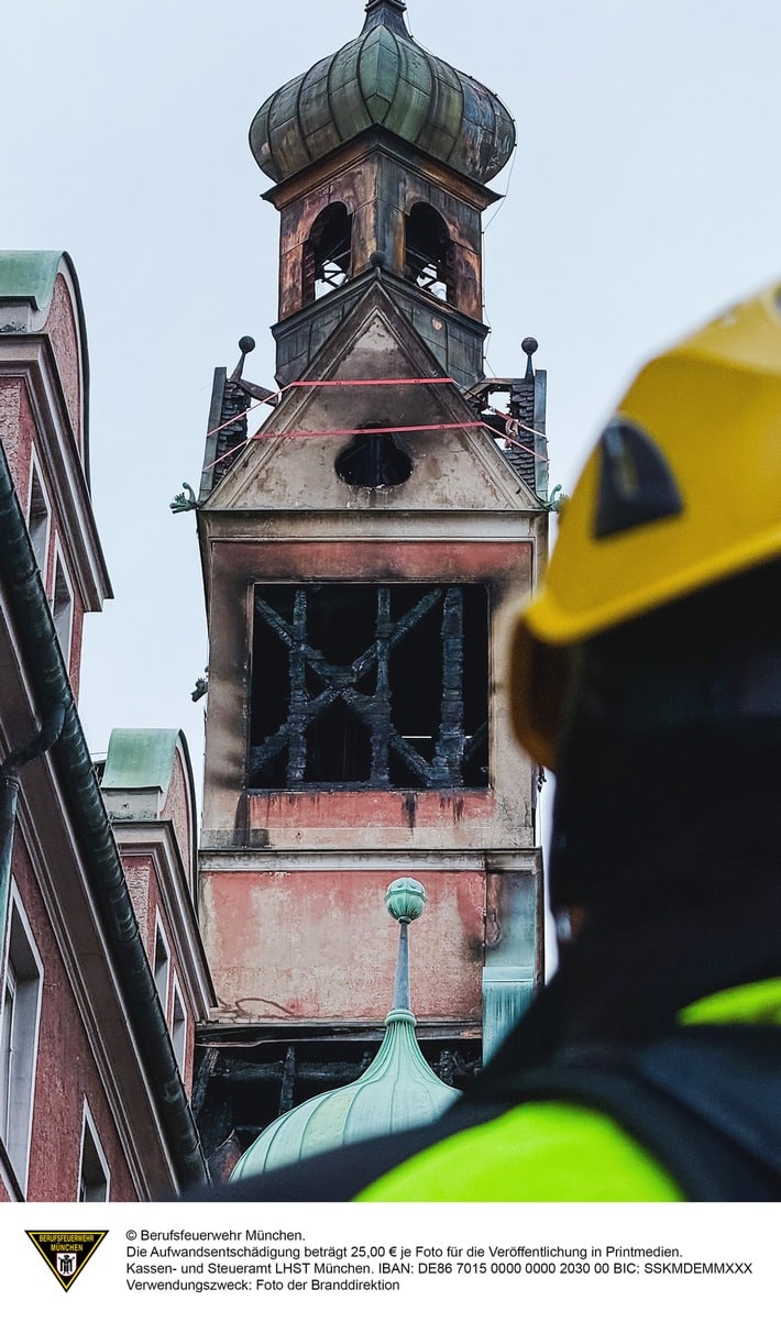 Der Turm wurde nach dem Brand als einsturzgefährdet eingestuft. Der heutige Einsatz erfolgte ausschließlich zur Sicherung loser Anbauteile. Entgegen anderslautenden Meldungen drohte der Turm nicht einzustürzen.
