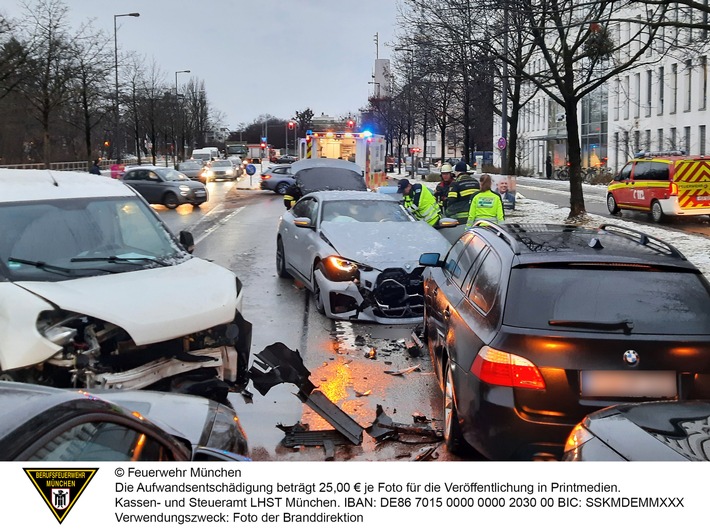 Die betroffenen Fahrzeuge sind zum Teil schwer beschädigt worden. Einsatzkräfte der Feuerwehr übernahmen die medizinische Erstversorgung des Unfallfahrers bis zum Eintreffen des Rettungsdienstes. Durch die Feuerwehr wurden auslaufende Betriebsstoffe gebunden, der Brandschutz sichergestellt und eine Verkehrsabsicherung eingerichtet. Da die Erkundung durch den Zugführer der Feuerwehr ergab, dass es sich beim Auto des Unfallverursachers um ein Hybrid-Fahrzeug handelt, wurde über die Integrierte Leitstelle das passende Rettungsdatenblatt angefordert. Mit den Informationen aus der Rettungskarte konnten die Hochvolt-Komponenten am Fahrzeug schnell und sicher deaktiviert und so weitere Gefahren für die Einsatzkräfte minimiert werden. Der 94-Jährige wurde vom Rettungsdienst in eine Münchner Klinik transportiert.