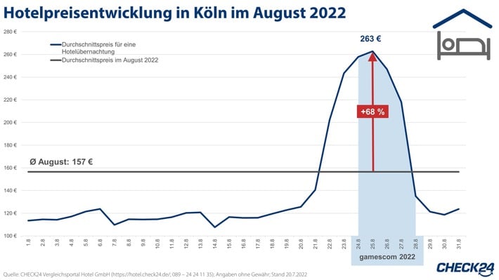 1) allgemeine Suchkriterien: Gästebewertung mind. gut, Preise für ein Zimmer, zwei Erwachsene, Umkreissuche: max. zwei Kilometer Luftlinie von der Messe Köln (Messeplatz 1) entfernt; Übernachtungszeitraum während der gamescom: Donnerstag, 25.8. bis Freitag, 26.8.2022; Vergleichszeitraum: Donnerstag, 1.9. bis Freitag, 2.9.2022; Stand der Preise: 20.7.2022; alle betrachteten Hotels und weitere Ergebnisse unter: http://www.check24.de/files/p/2022/4/9/2/17827-2022_07_28_tabellen_preisvergleich.pdf