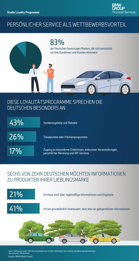 Nur Waren und Dienstleistungen zu verkaufen reicht heute nicht mehr aus: 82 Prozent der Deutschen sind der Meinung, dass gute Marken ihren Kundinnen und Kunden mehr bieten müssen. Unternehmen punkten insbesondere durch einen exzellenten Fokus auf den Kunden. 83 Prozent der befragten Bundesbürgerinnen und Bundesbürger bevorzugen Marken, die sich persönlich um ihre Kundschaft kümmern. Dabei haben Loyalitätsprogramme eine zentrale Bedeutung. Aus Sicht von 77 Prozent der Befragten zeigen Marken damit, dass ihnen die Beziehung zu Kundinnen und Kunden wichtig ist. Dies zeigen die Ergebnisse der repräsentativen Online-Umfrage „Loyalty Programme“ im Auftrag der BMW Bank, für die im Juli 2025 insgesamt 1.000 Bundesbürgerinnen und -bürger befragt wurden.
