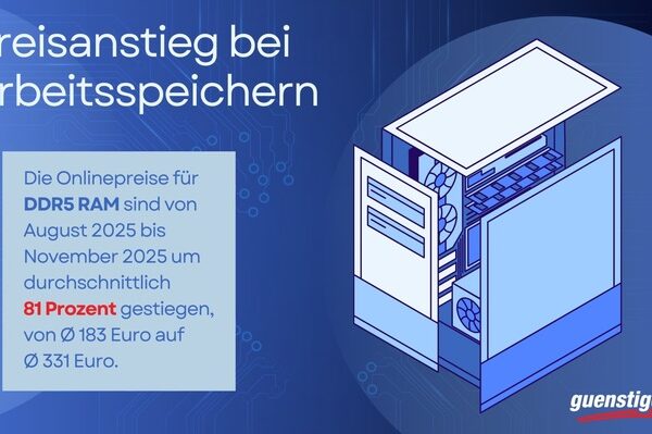 Hamburg (ots) – Eine aktuelle Analyse des Vergleichsportals guenstiger.de zeigt einen auffallend starken Preisanstieg bei Arbeitsspeichern in den vergangenen vier…