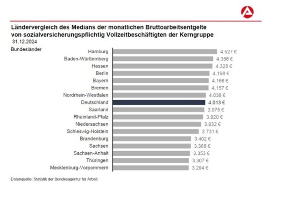 Nürnberg (ots) – – Medianentgelte stiegen im Jahr 2024 auf monatlich 4.013 Euro – Gender-Pay-Gap liegt bei 346 Euro und…