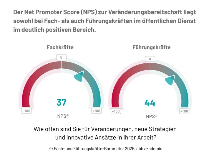 Kommunal-, Landes- und Bundesverwaltung, Bildungseinrichtungen, Polizei, Justiz und Sozialverwaltung. Rund zwei Drittel der Befragten sind Fachkräfte und ein Drittel Führungskräfte. Die Erhebung wurde im Frühjahr 2025 anonym und auf freiwilliger Basis durchgeführt. Zur Analyse kamen sowohl quantitative als auch qualitative Verfahren zum Einsatz. Ein zentrales Instrument war der Net Promoter Score (NPS), mit dem Einschätzungen zu Themen wie Zufriedenheit, Wertschätzung, Digitalisierung oder Weiterbildungsbereitschaft differenziert erfasst wurden. Der Net Promoter Score (NPS) misst auf einer Skala von 0 bis 10, wie wahrscheinlich es ist, dass Personen ein Unternehmen oder eine Aussage weiterempfehlen würden. Aus den Antworten ergibt sich ein Wert zwischen -100 und +100, indem der Anteil der Kritiker (0-6) vom Anteil der Befürworter (9-10) abgezogen wird. Positive NPS-Werte zeigen Zustimmung, während negative Werte auf Unzufriedenheit oder Ablehnung hindeuten.